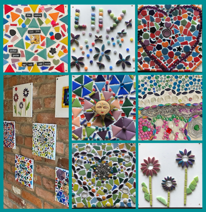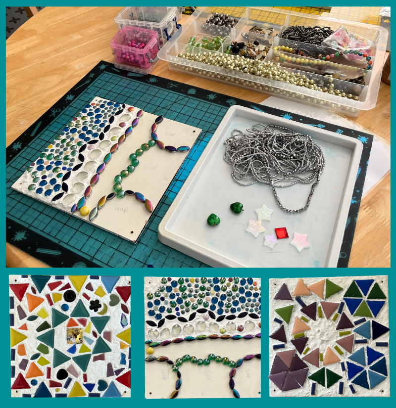 For safety reasons we were restricted in the mixed-media materials we could use – no sharp edges, for example. So, in addition to shaped mosaic pieces, we collected together random beads, buttons, and other small items such as house keys and fridge magnets that could either be glued onto the MDF panels directly, or stuck to areas of grout afterwards.